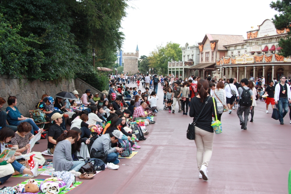Warum sitzen diese Leute neben der Hauptstraße? Richtig, sie warten auf die Parade. Ab einer Stunde vor der eigentlichen Parade darf man sich mit seiner Plastikdecke niederlassen und so die schönsten Plätze sichern. Diszipliniert, wie alle sind, bleiben aber auch alle während der Parade sitzen, so dass auch die hinteren Reihen immer noch etwas sehen können – auch und insbesondere die kleineren Besucher.