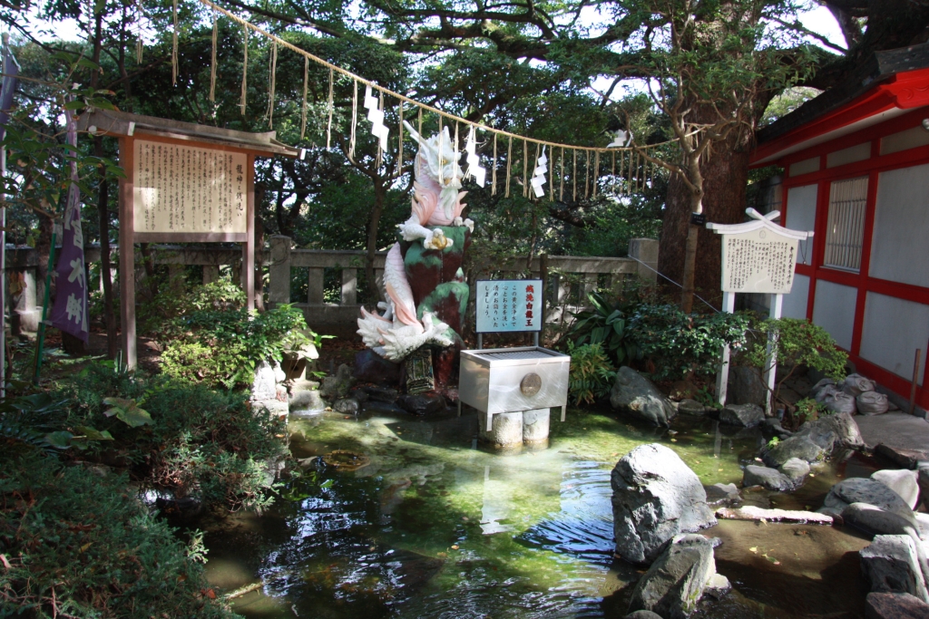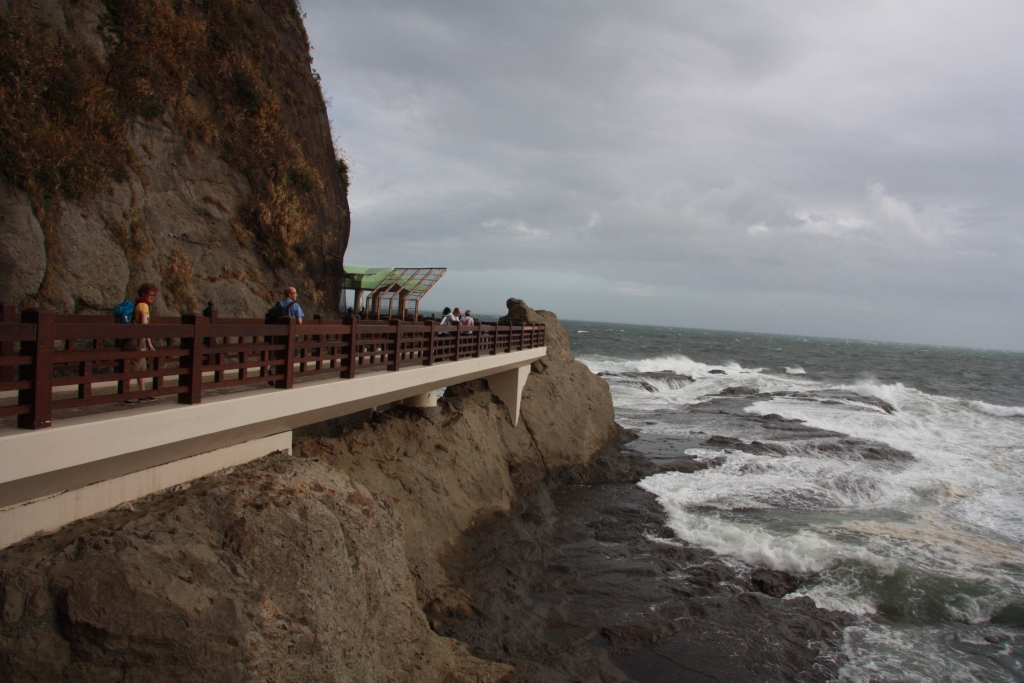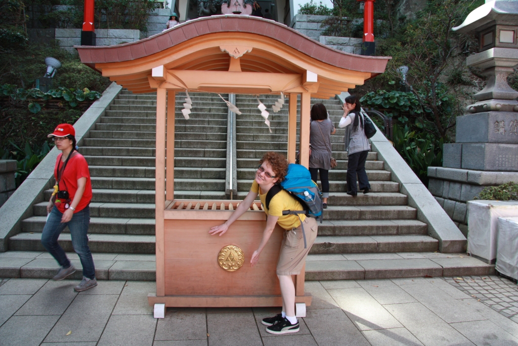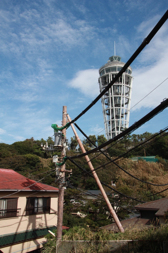 Der erste wirkliche Besichtigungsstop war dann Enoshima. Eine kleine Insel, die noch per Brücke mit dem Festland verbunden ist. Erste Erkenntnis nach der Ankunft: Es ist windig. Sehr windig, um nicht zu sagen leicht stürmisch. Sind wohl noch die letzten Nachwirkungen des Taifuns, der uns den Regen bei der Ankunft bescherte. Ansonsten bietet selbige Insel erst einmal den obligatorischen Schrein (rel. drachenlastig).