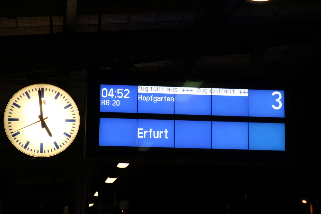 So stehe ich dann also fast allein (es waren noch 2 andere auf dem Weg nach Frankfurt) mitten in der Nacht auf dem Bahnhof Weimar. Um es uns dann noch so richtig reinzudrücken, fährt dann der Anschlusszug, den wir in Erfurt hätten erreichen wollen, direkt an uns vorbei. Ohne zu halten. Das tut er nur Montags. Ganz toll. Also eine Stunde warten und den nächsten Zug nehmen. Der hält in Weimar. Immer. Und fährt dann nach Frankfurt durch.