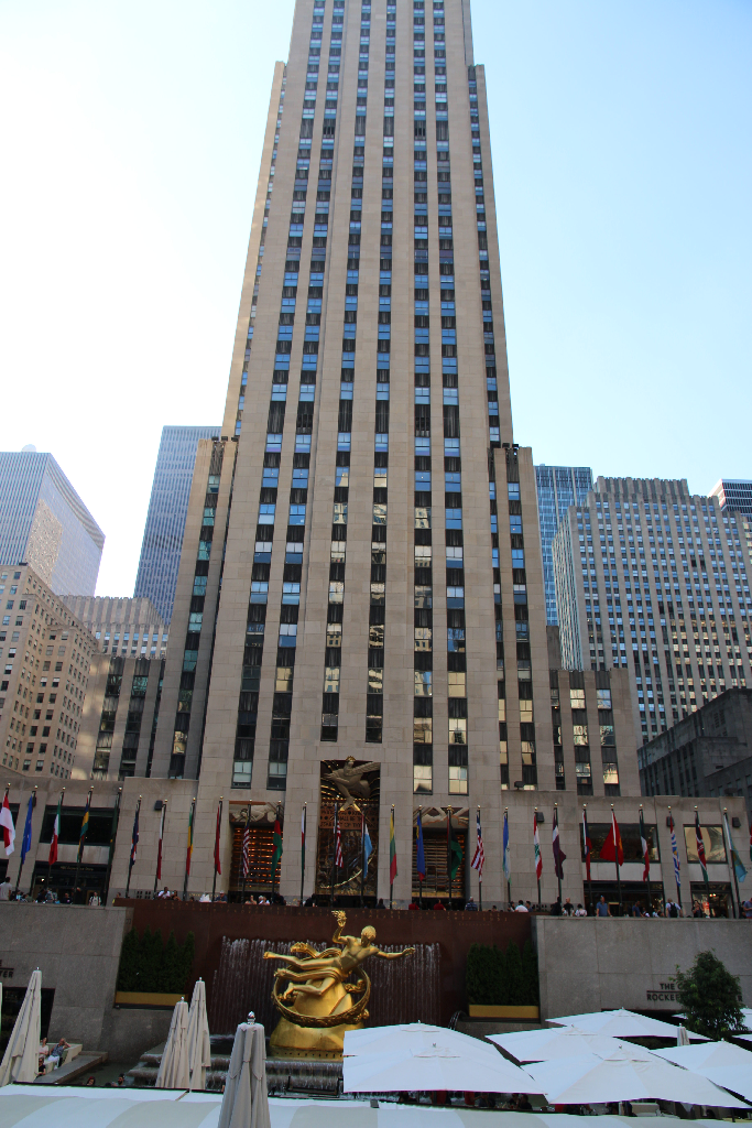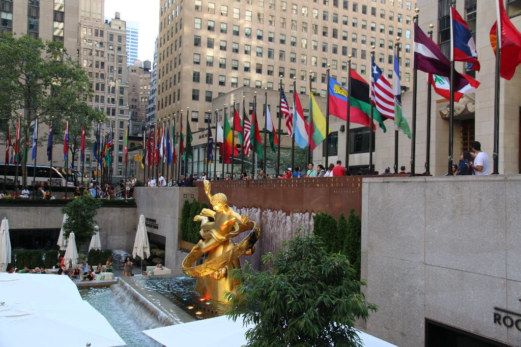 Und man kann sich schließlich auch noch das Rockefeller-Center anschauen. Ja auch im Lego-Laden waren wir – die Photos erspar ich aber an dieser Stelle. Die Shoppingmeile unter dem Center auch – da war ohnehin keiner mehr und auch schon viele Läden geschlossen. Aber so ein kleiner Flaggenpark und Springbrunnen vor dem Eingang ist doch auch ganz nett … könnten wir in Jena auch mal einführen.