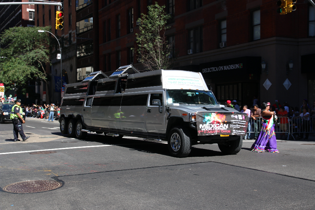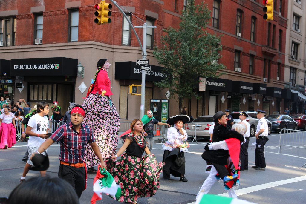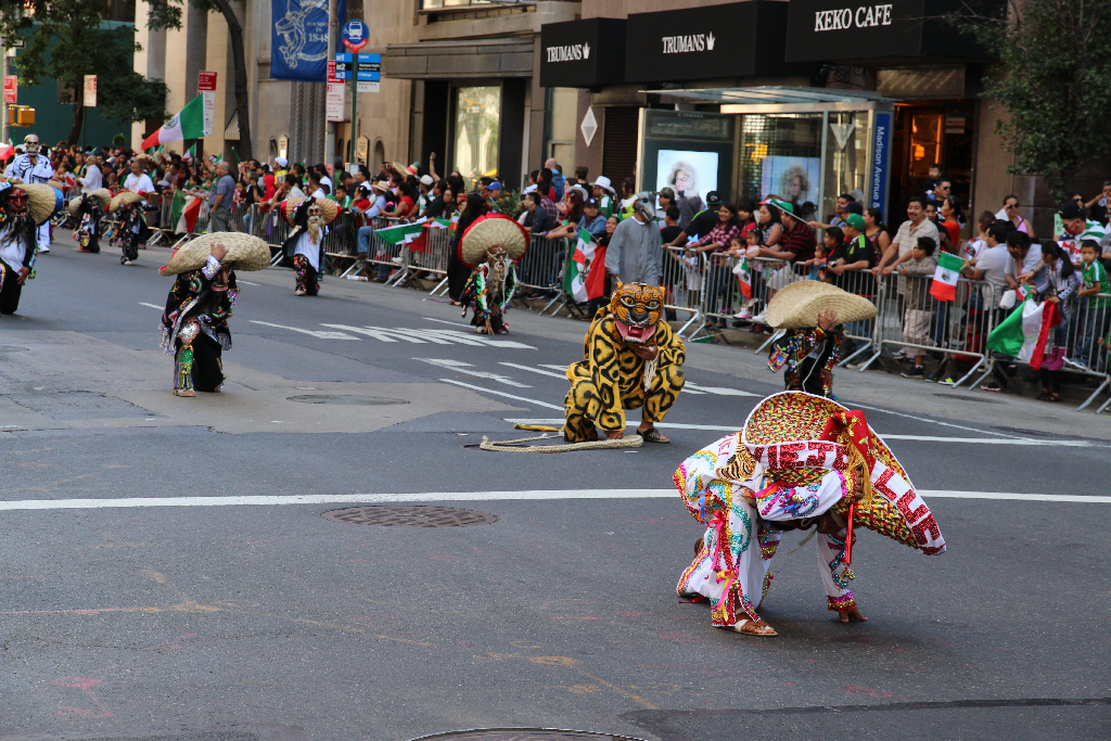 Naja gut, dachte ich mir, dann such ich mir halt etwas zu essen und komm dann nochmal. Auf dem Weg kam dann ein Haufen Krach aus einer Seitenstraße. Ok, ich hab Zeit, also nachschauen. Damit hatte ich dann quasi auch mein komplettes Nachmittagsprogramm: Nicht dass ich irgendwas über den Anlass wüsste, aber die mexikanische Gemeinde New York zog da stundenlang durch die Straßen. Wobei es von traditionellen (?) Kostümen (Karneval??) bis auch zu etwas aktuelleren Dingen reichte. Nicht zu sehen sind die ausgiebigen Diskussionen mit der Polizei, wo man denn nun stehen könne und wo nicht. Vielleicht hätt ich einfach dreist, wie die Pressephotographen auf der Straße zwischen dem Umzug rumrennen sollen. Aber man ist ja halbwegs gesetzestreu – insbesondere in einem Land, dass seinen vermeintlich Straffälligen auch gerne mal ein paar Wochen Kuba spendiert.