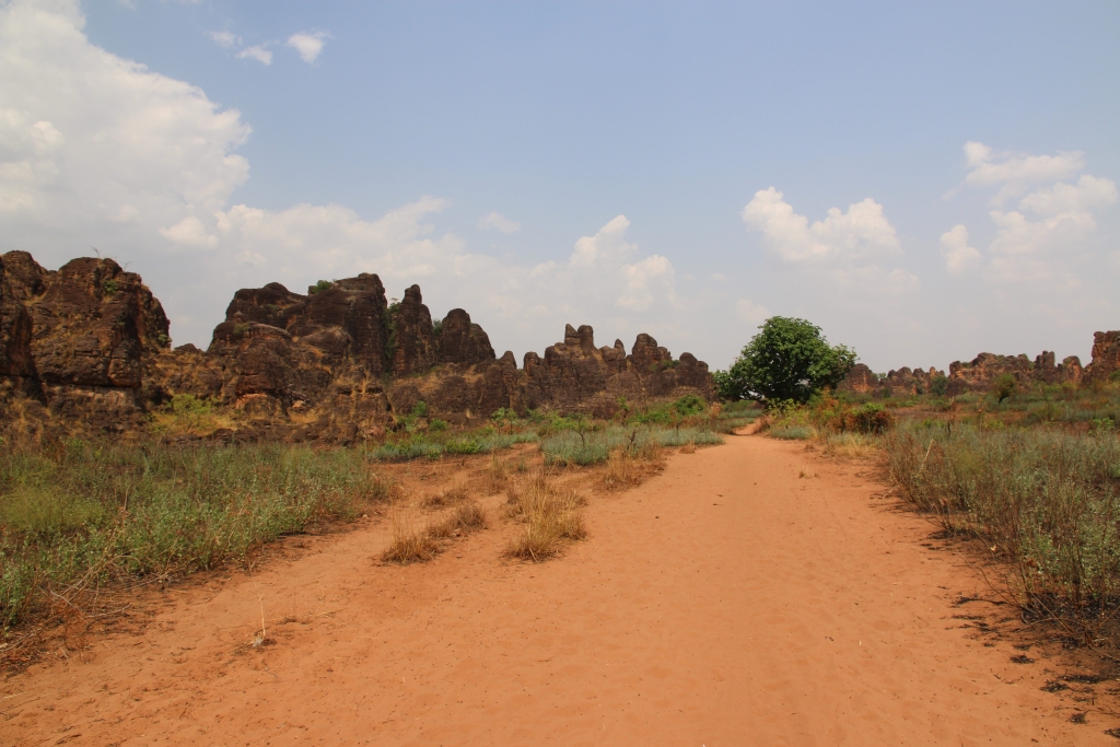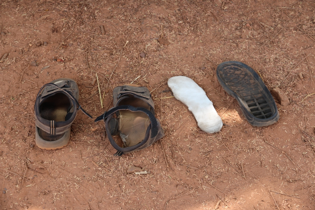 Was gibt es hier noch so? Man kann zB sich nochmal ins Auto setzen und etwas gen Süden fahren. Da gibt es dann “pics de Sindou”. Das sind im Wesentlichen ein paar nett anzuschauen Felsen, um die man herumlaufen kann. Dazu ein paar Empfehlungen: Wenn man da mittags lang läuft, genug Wasser nicht vergessen. So wirklich mit nochmal verpflegen unterwegs oder den Rückweg abkürzen ist nicht. Auch wohl der Mittagssonne geschuldet, Kondition schadet nicht. Achja und halbwegs haltbares Schuhwerk ist auch irgendwo ratsam. Gegenbeispiel siehe Photo. Ich kann aus eigener Erfahrung sagen, dass mit jeder fehlenden Lage unter den Füßen, der Sand irgendwie wärmer und die Steine spitzer werden. Aber gut – wieder Gepäck für den Rückflug gespart.