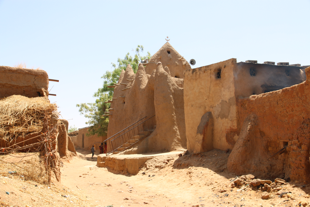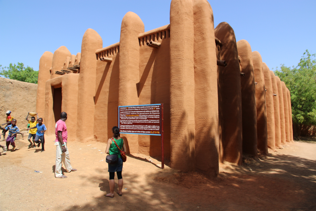 Aber es gibt hier auch noch etwas, was in anderen Teilen der Welt die Altstadt wäre: Dort, wo Segou mal angefangen hat. Also organsiere man sich einen lokalen Führer (ok, der wird schon für einen organisiert; war ja mal Touristadt und hat jetzt kaum Touris) und fahre da mal hin. Leicht gewöhnungsbedürftig ist es dann doch, dass uns der erste Weg dort direkt ins Haus des Ortsvorstehers. Der wird dann bezahlt, dass man sich sein Dorf anschauen kann. Außerdem hat er einen kurzen geschichtlichen Abriss auf einer Wand in seinem Haus. Viel Zeit war dort aber nicht, der Mann hatte Termine und musste los.