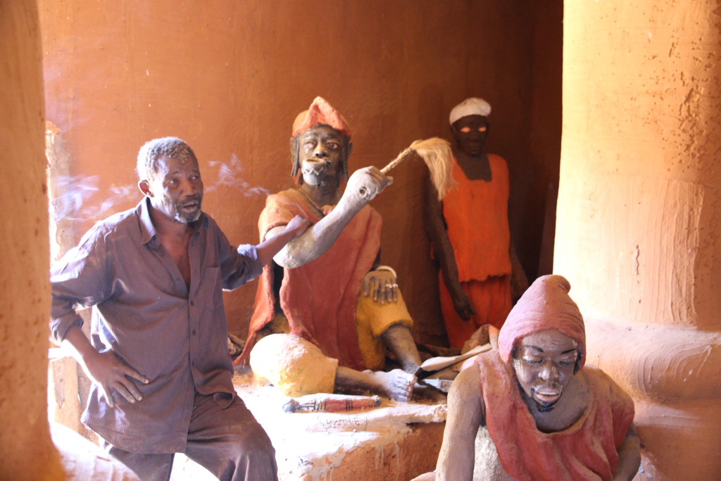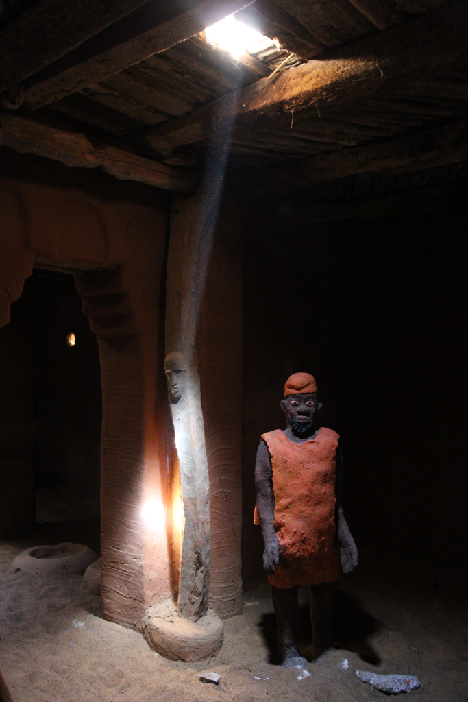 Drinnen allerdings ist ein Mann namens Beckenbauer (ja, wirklich – kein Scherz) dabei, Figuren zu basteln, die typische Szenen vom damaligen Königshof darstellen. Auch sehr interessant ist der Lichteinfall in dem Haus: Fenster gibt es ja nicht, nur diese Löcher ind er Decke, die wir auch schon bei der Moschee in Bobo gesehen hatten.