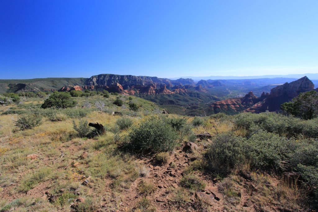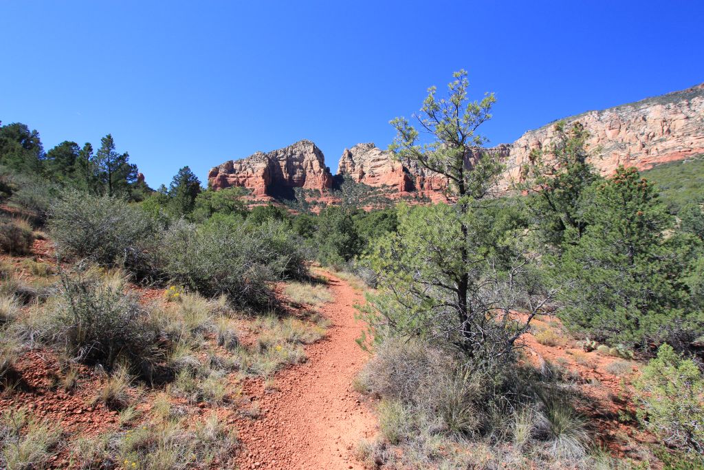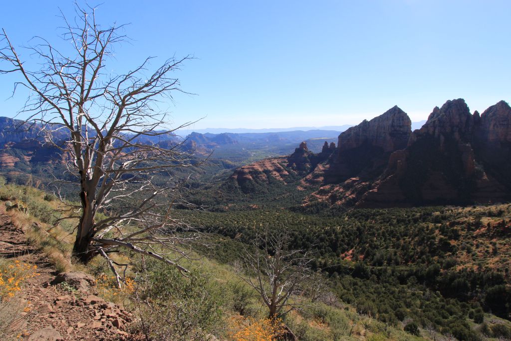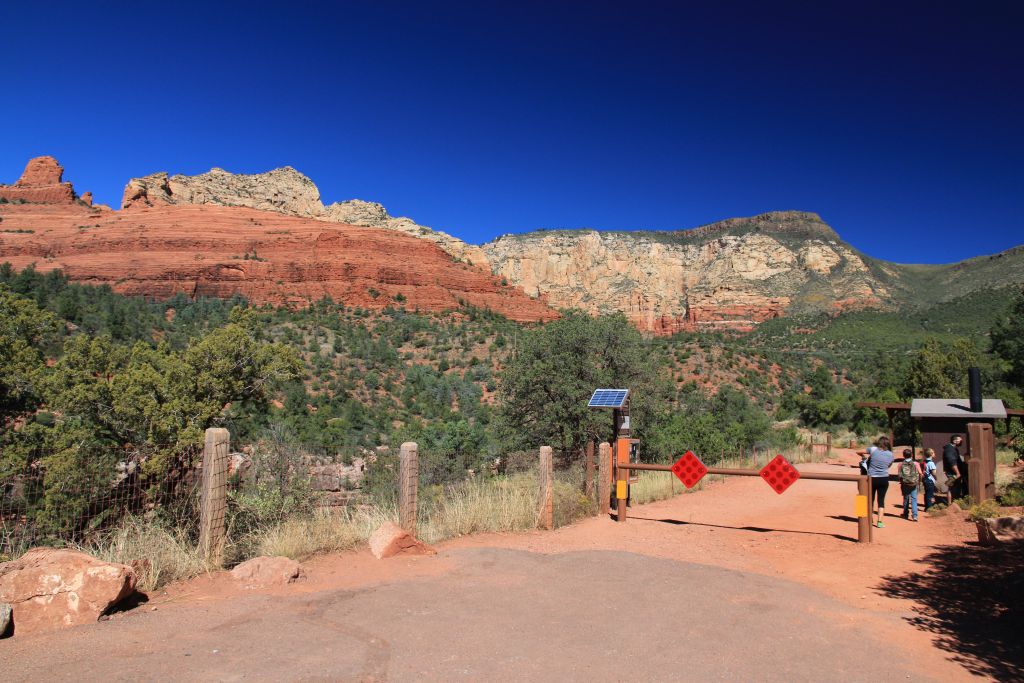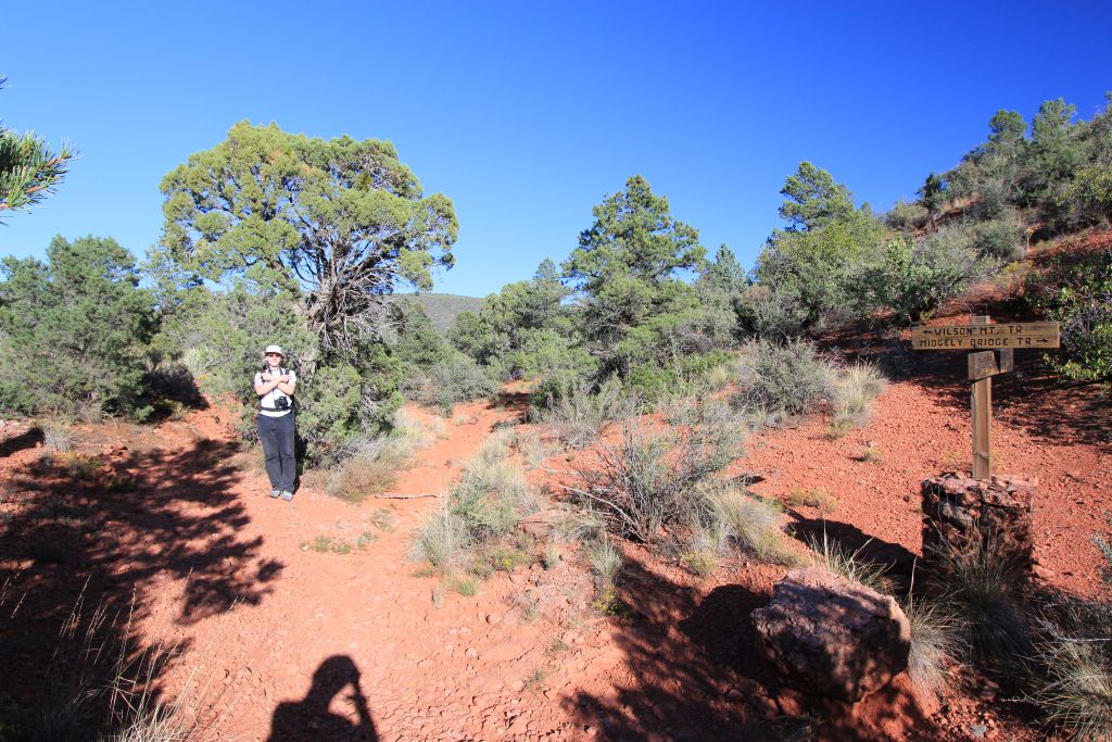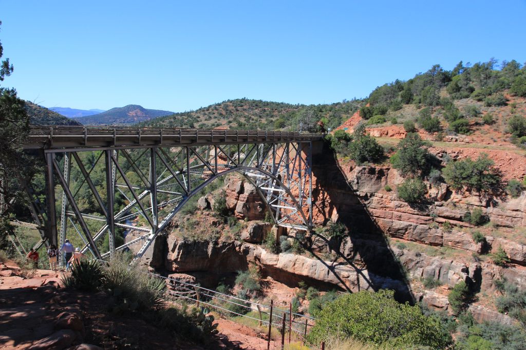 Sunday, December 4th, 2016Südlich von Flagstaff liegt noch Sedona. Kein Nationalpark, aber trotzdem einen Abstecher wert. Hier gibt es die üblichen zwei Varianten: Entweder nur zum Parkplatz fahren und von dort Photos machen oder etwas länger laufen. Wir haben uns natürlich für Zweiteres entschieden. Trotzdem auch noch zwei Photos vom Parkplatz aus. Man merke sich die Brücke als Wegmarke. Ansonsten ist das Ziel der Berg rechts im Hintergrund.