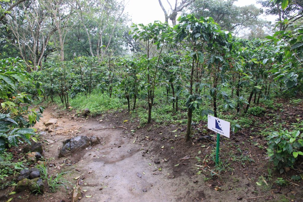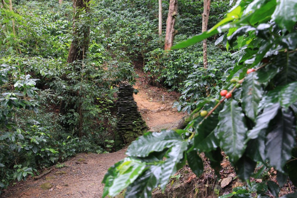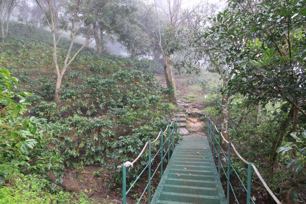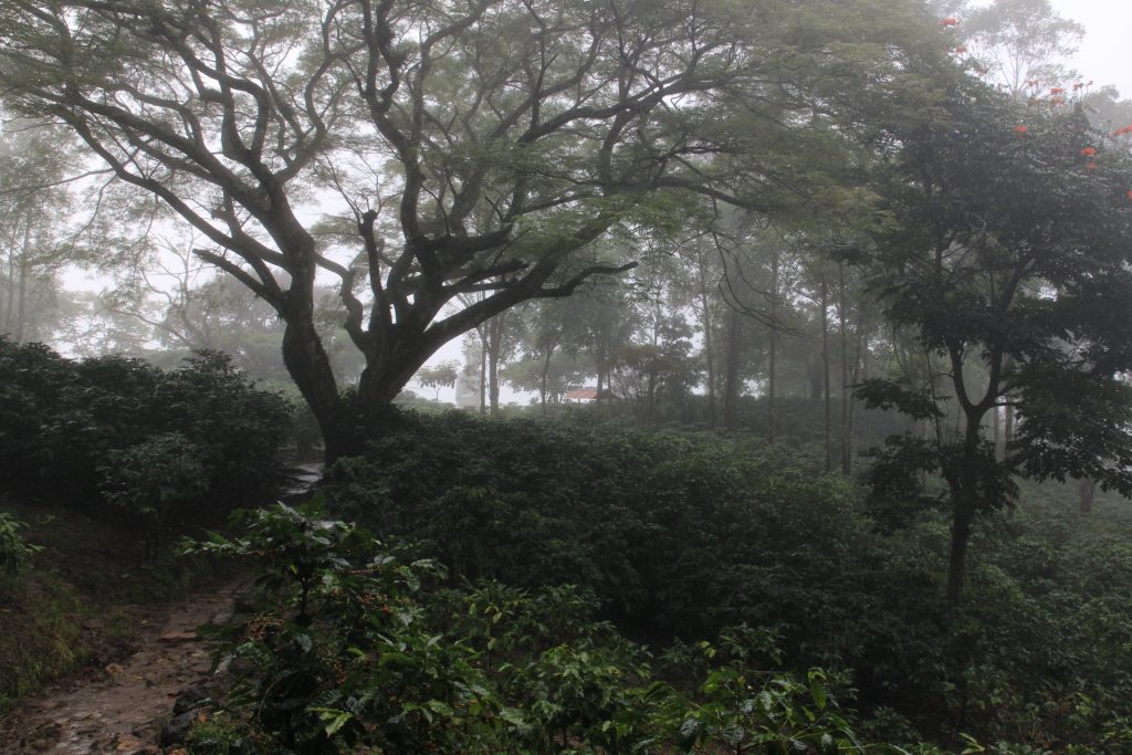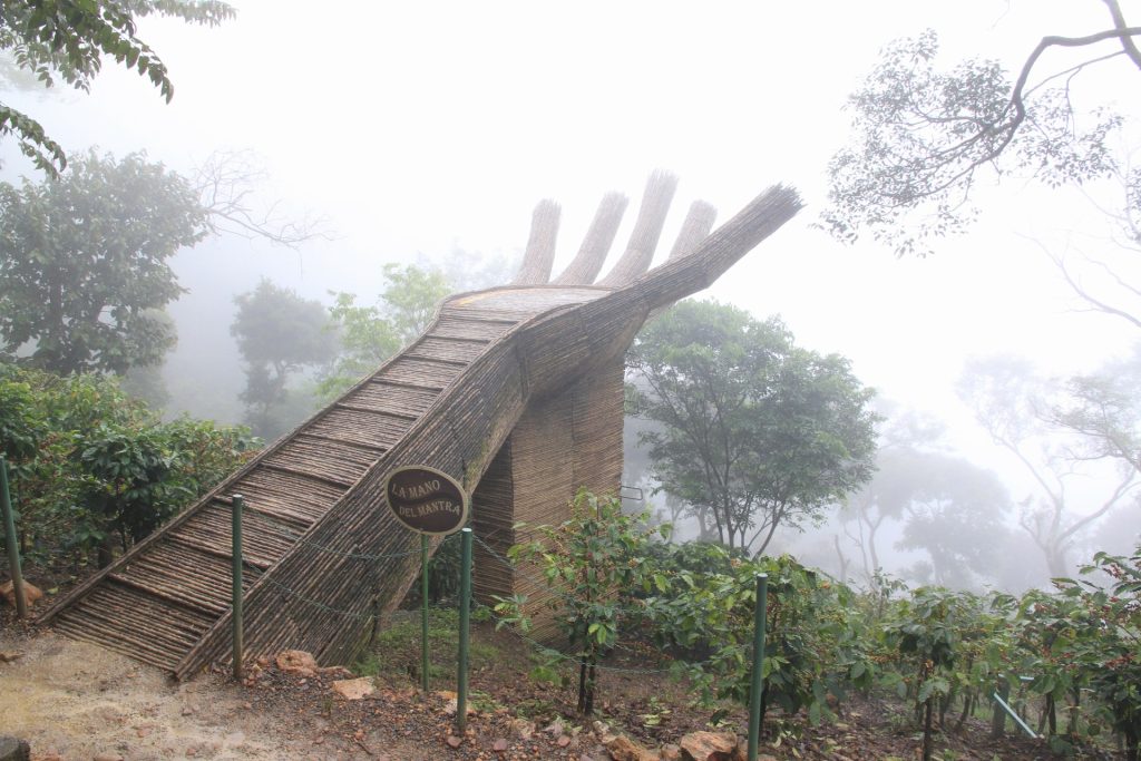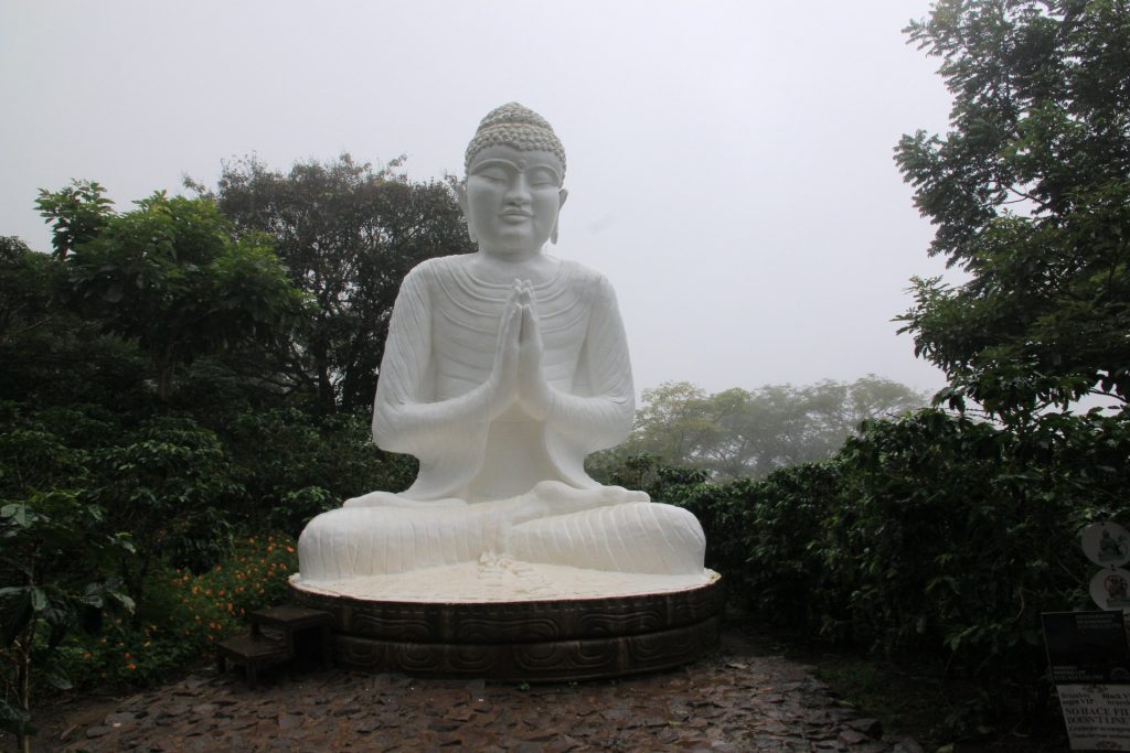 Weil irgendwann auch die Museen alle sind und man etwas Hoffnung auf besseres Wetter hat, war ein weiteres Ziel etwas vor der Stadt eine Kaffeeplantage. Die Hoffnung mit dem Wetter hatte sich aber nach 100m in der Plantage schon wieder aufgelöst und so ging es schön durch den Matsch auf einen “Mantra Trail”. Wieso und warum wurde nicht erklärt, aber einen Buddha gab es entlang des Weges, wie auch eine begehbare Hand. Der Nebel ist jetzt hier also als Platzhalter für eine schöne Aussicht ins Tal zu verstehen, also bitte selbstständig auffüllen.
