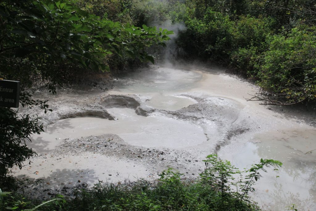Und nachdem das hier ja eigentlich ein Vulkan ist, kommen da auch an verschiedenen Orten warme Sachen aus dem Boden. Meistens eher Wasser oder Dampf mit einem wohlig warmen Schwefelaroma, an anderer Stelle war aber zu viel Dreck dazwischen und es kommt nur noch als Schlamm hoch. Hier dann auch eher in abwechslungsreichen Fassung, d.h. nicht alles auf einmal oder kontinuierlich, sondern immermal wieder. Einen Rhythmus konnte ich nicht feststellen, aber wenn man die Kamera lang genug in die richtige Richtung hält (und die Niederländer von sich hinreichend fern), dann klappt das auch mit dem Video dazu.