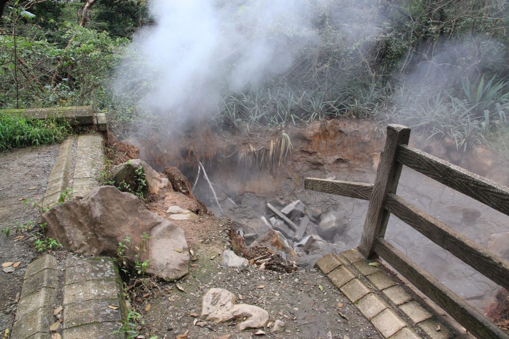 An anderer Stelle kam dann wieder das bekannte Schema zum Tragen, dass da irgendwie was fehlt. Da war dann der Vulkan scheinbar vor nicht allzu langer Zeit der Meinung, seinen Krater etwas verlegen zu müssen. Doof nur (also für den Park und die Leute), dass dort eine kleine Aussichtsplattform für den (alten) Krater war. Ist dem Vulkan aber recht egal und so gibt es jetzt einen leicht verschobenen Krater und etwas Plattform weniger.