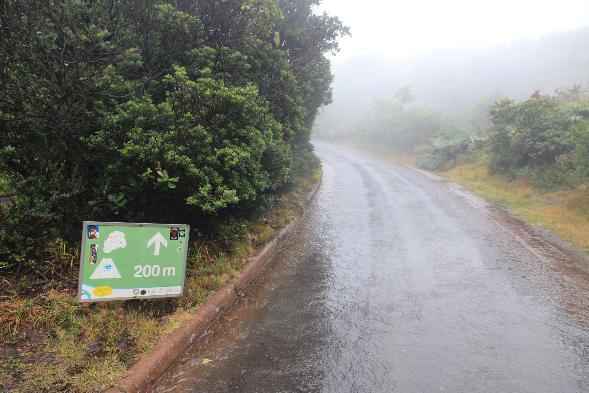 Grundsätzlich hatte ich ja mal gelernt, dass Wolken verschwinden, wenn sie sich abregnen. So war dann doch die Hoffnung da, dass man noch etwas vom Krater sehen könnte, wenn der Regen vorbei ist. Beim Irazú Volcano (ok, ohne Regen, aber sonst …) hatte das ja auch noch geklappt. Hier aber eher nicht. Und so gibt es ein Photo, wie es ausgehen hat (das dritte) und wie es hätte aussehen können (das vierte). Man kann nicht immer Glück haben …