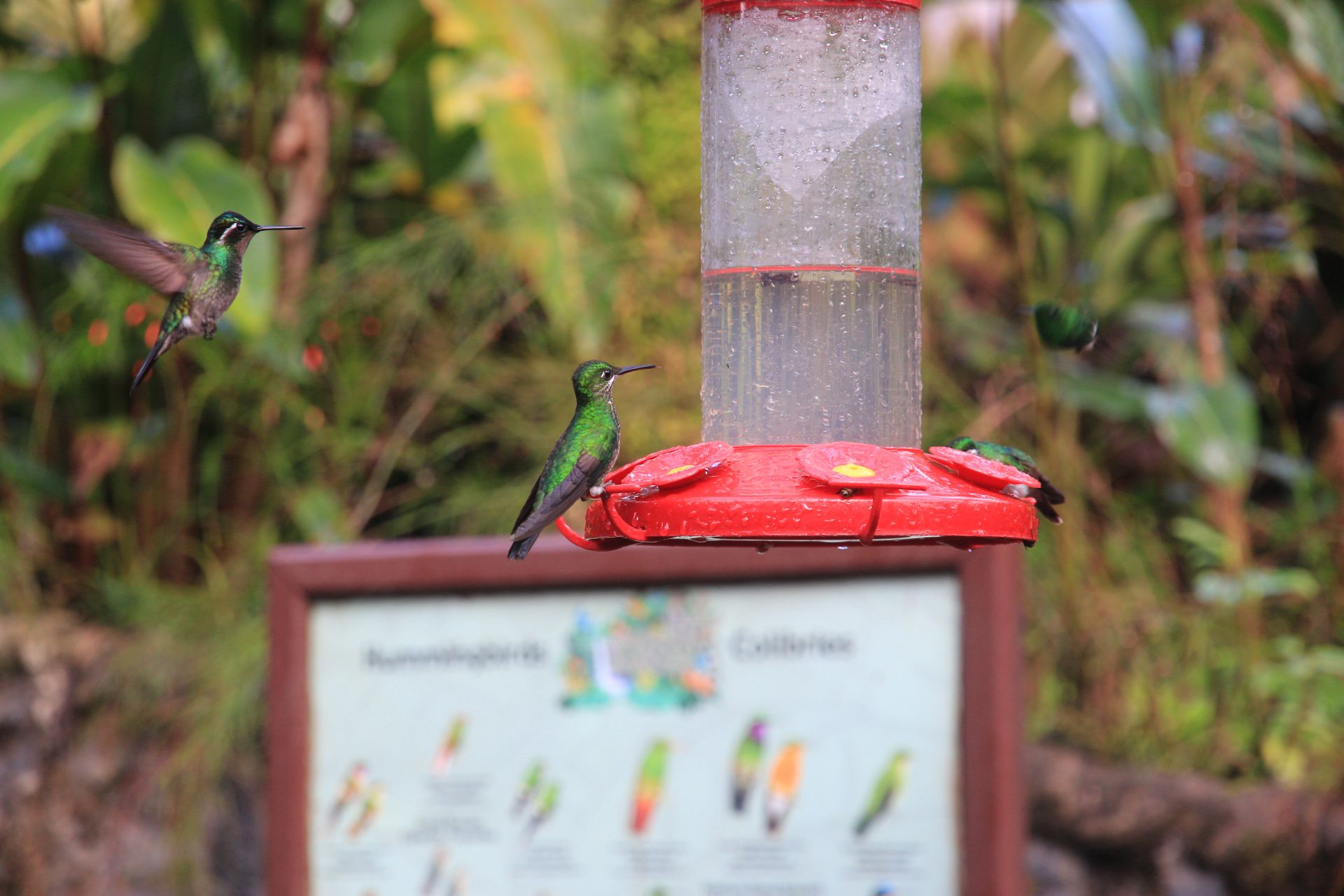Natürlich ist nicht alles nur Fauna, sondern auch noch diverse Flora. So blüht es dann an verschiedenen Ecken. Die Kolibris hier scheinen sich dann aber doch auf den einfachen Weg zu Essen in Form der Futterstellen zu konzentrieren. An den Blumen habe ich keine gesehen – kann aber auch wieder am Regen gelegen haben. Die Futterstellen waren überdacht.